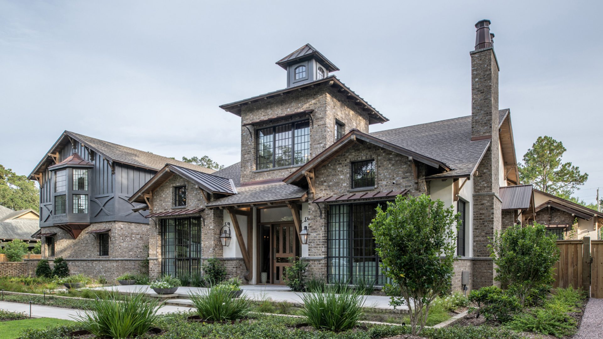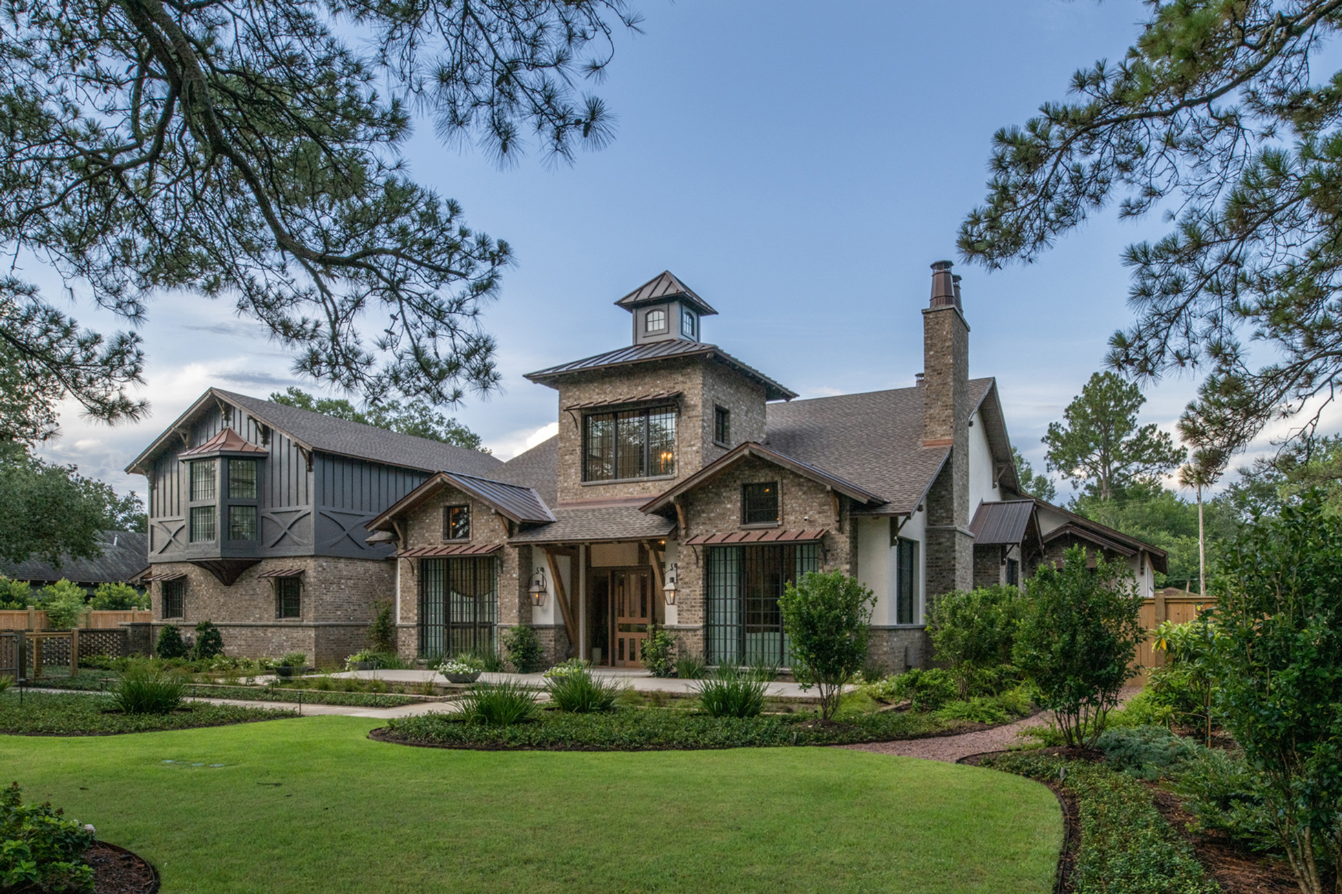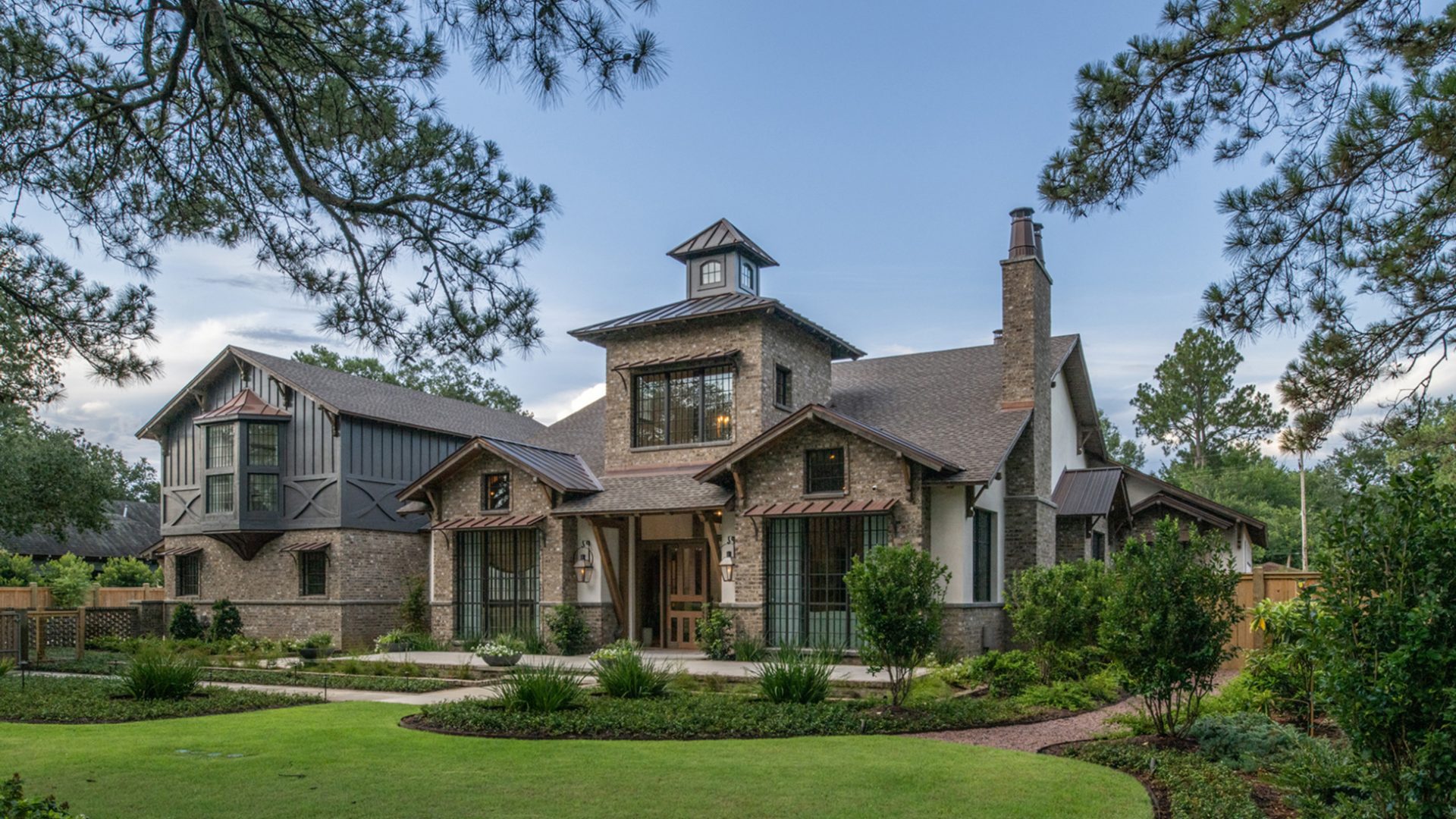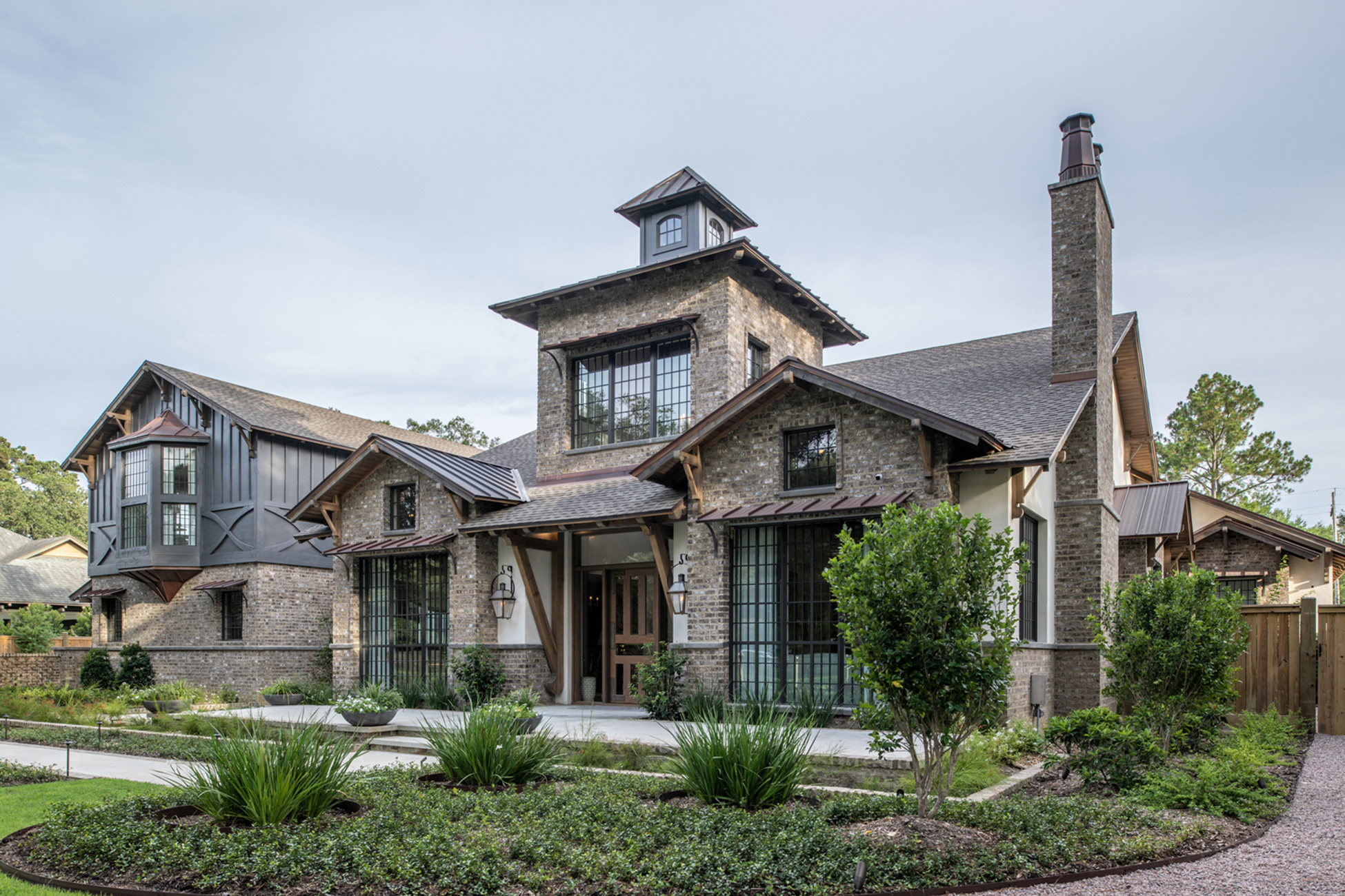 This home was built in an established neighborhood after removing the existing home and preserving the large oak and pine trees. The design morphs out of two styles, “Tudor” and “Nantucket.” both of which beg to be set in a suburban setting surrounded by aged landscaping to give the appearance of an old stately home. Given those design criteria, the materials of the home needed to reflect that same old stately appearance. That is why “Old Savannah Tumbled” king-size brick was chosen for this project. The brown hues in the brick along with the face irregularities represent that old world style and aged appearance needed to compliment the cypress, plaster and copper materials used on the exterior of the home. The warmth of the materials invite visitors into the home through the giant oaks and beautifully landscaping surrounding the home.