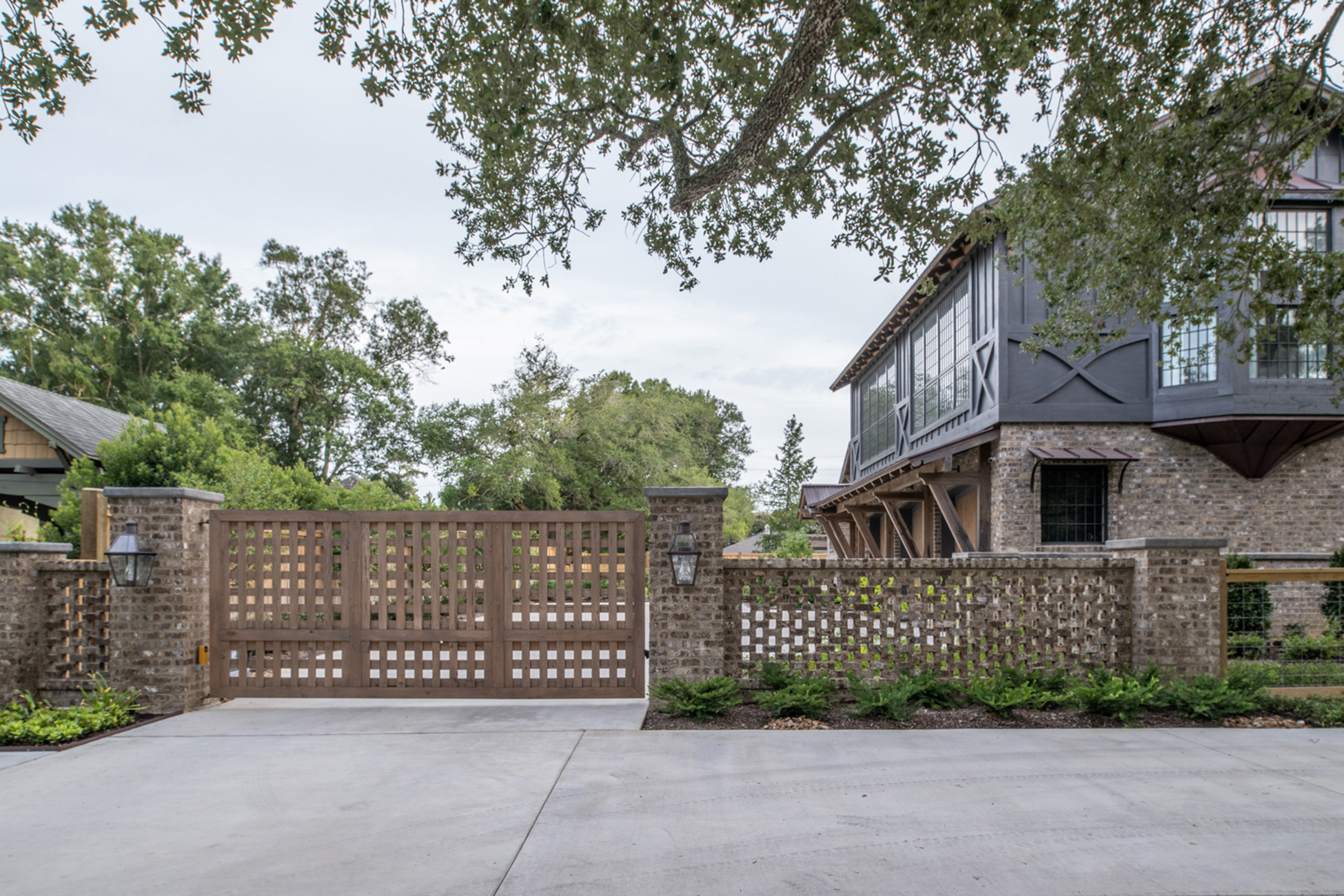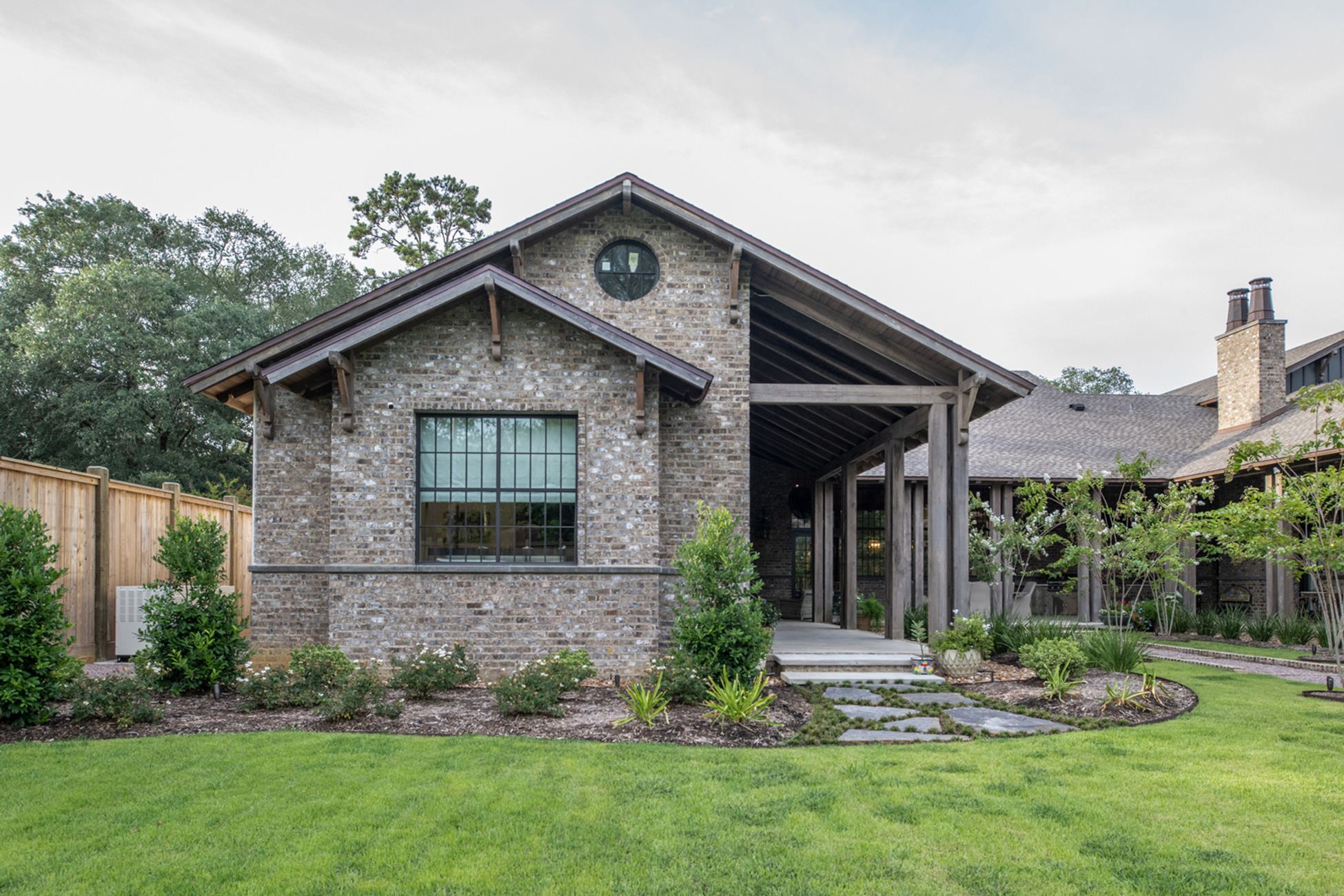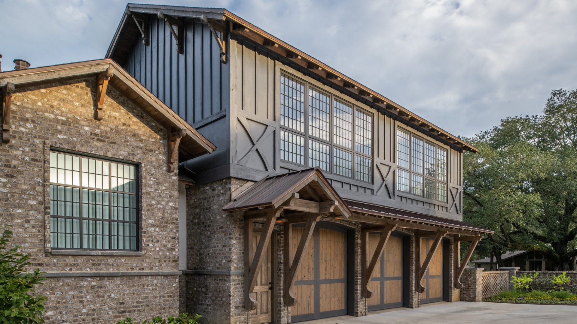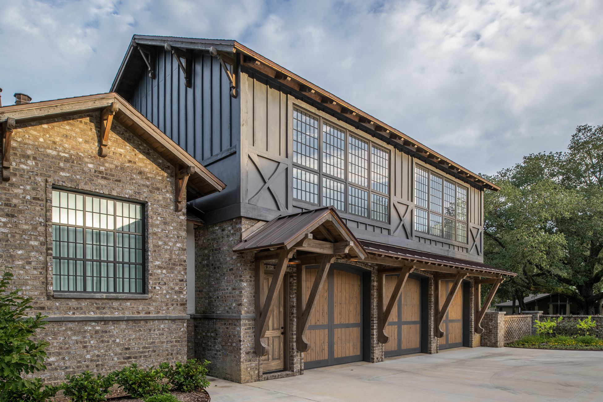 This home was built in an established neighborhood after removing the existing home and preserving the large oak and pine trees. The design morphs out of two styles, “Tudor” and “Nantucket.” both of which beg to be set in a suburban setting surrounded by aged landscaping to give the appearance of an old stately home. Given those design criteria, the materials of the home needed to reflect that same old stately appearance. That is why “Old Savannah Tumbled” king-size brick was chosen for this project. The brown hues in the brick along with the face irregularities represent that old world style and aged appearance needed to compliment the cypress, plaster and copper materials used on the exterior of the home. The warmth of the materials invite visitors into the home through the giant oaks and beautifully landscaping surrounding the home.