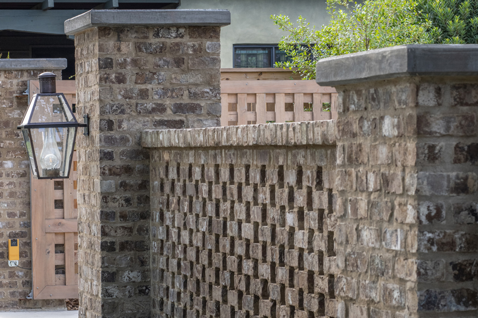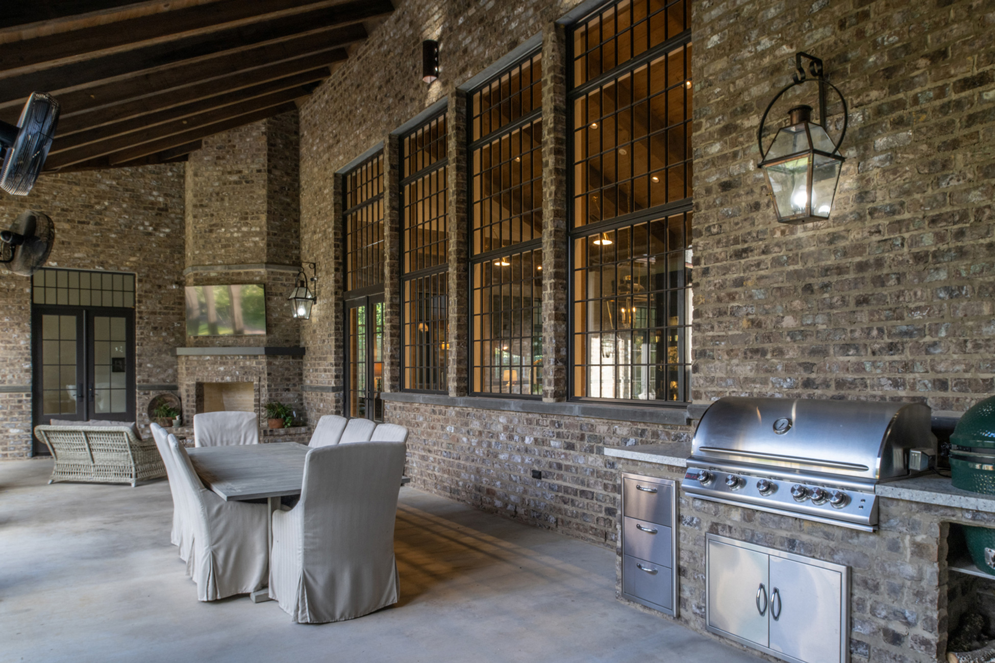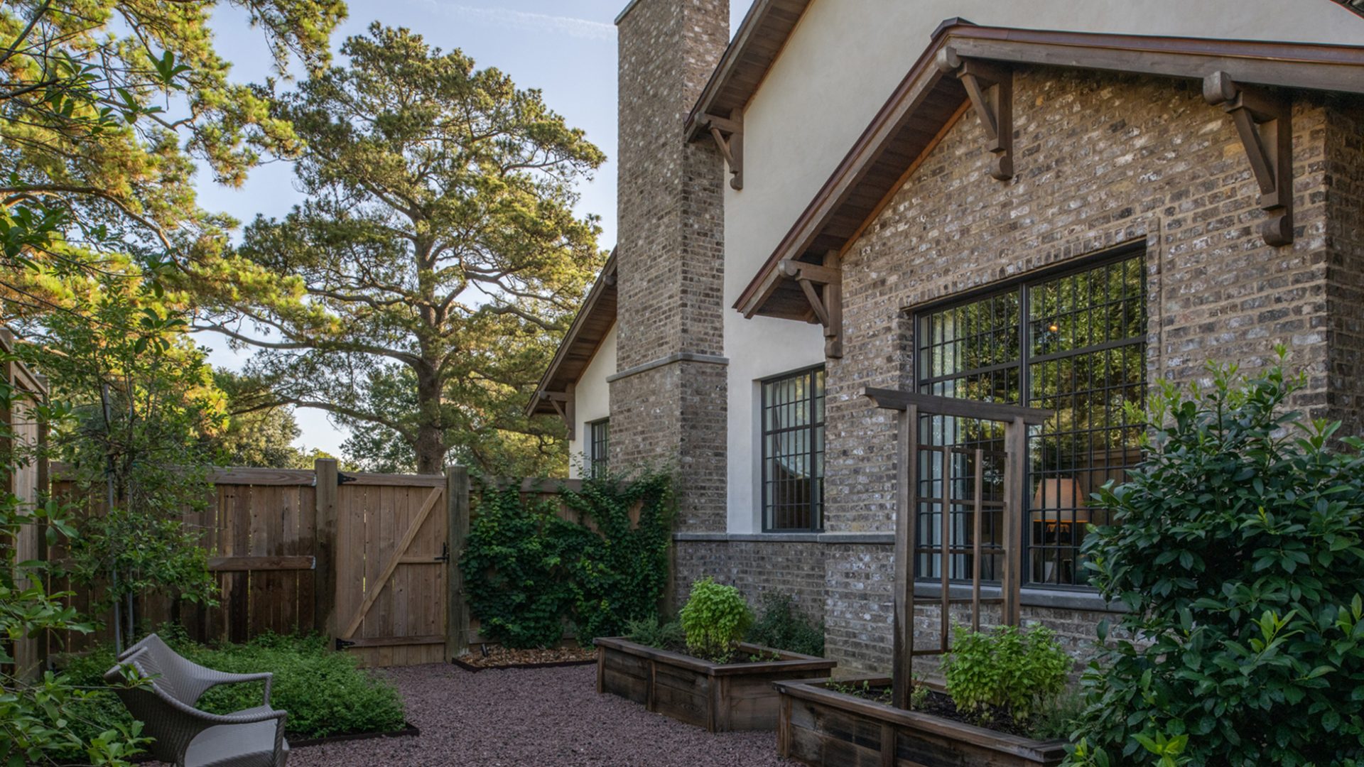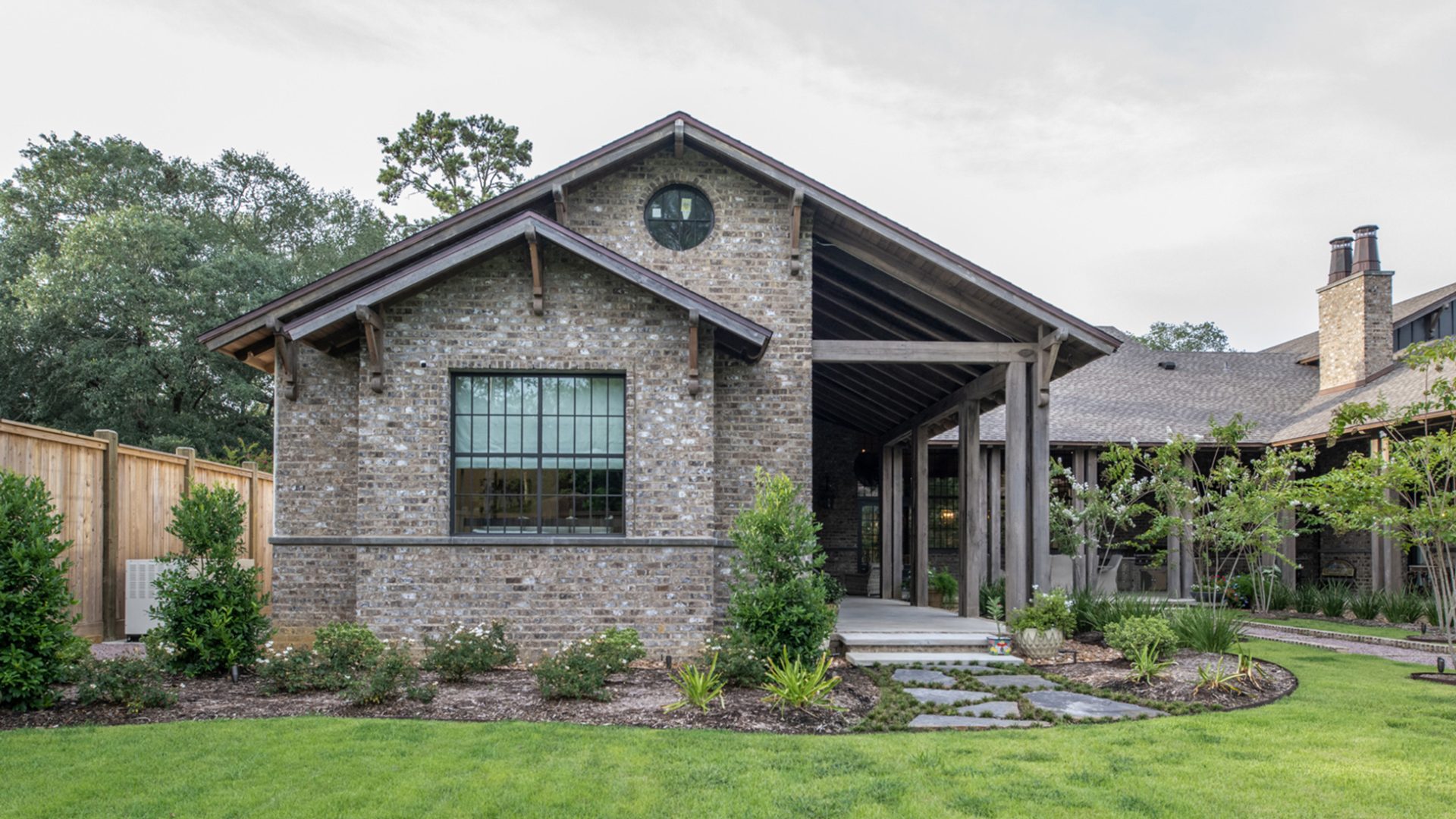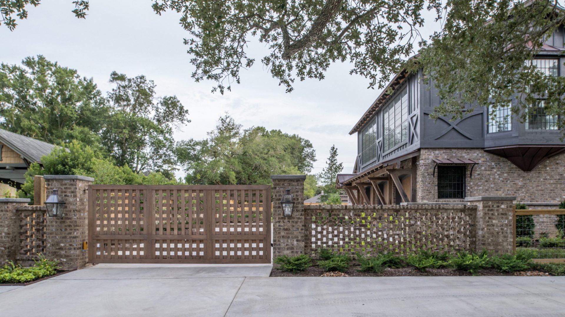 This home was built in an established neighborhood after removing the existing home and preserving the large oak and pine trees. The design morphs out of two styles, “Tudor” and “Nantucket.” both of which beg to be set in a suburban setting surrounded by aged landscaping to give the appearance of an old stately home. Given those design criteria, the materials of the home needed to reflect that same old stately appearance. That is why “Old Savannah Tumbled” king-size brick was chosen for this project. The brown hues in the brick along with the face irregularities represent that old world style and aged appearance needed to compliment the cypress, plaster and copper materials used on the exterior of the home. The warmth of the materials invite visitors into the home through the giant oaks and beautifully landscaping surrounding the home.