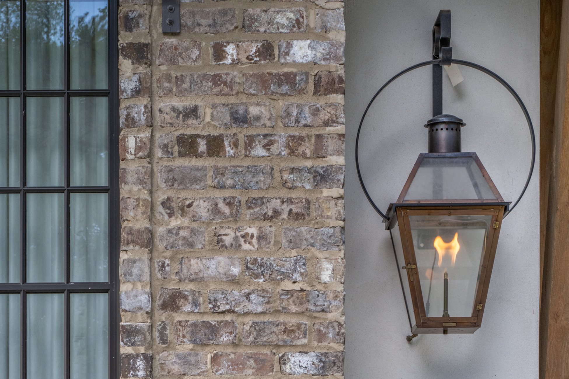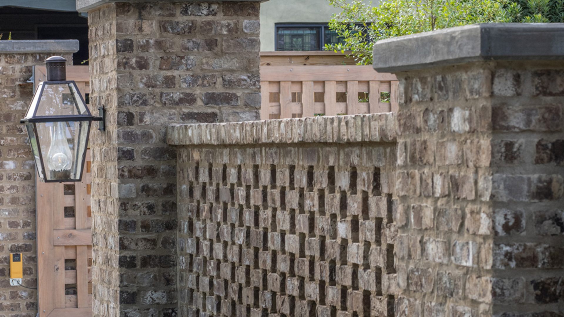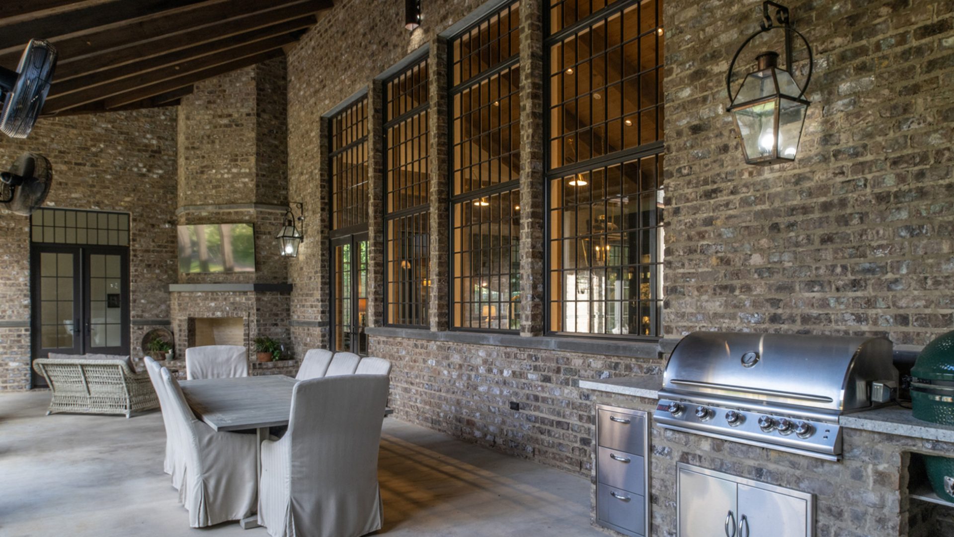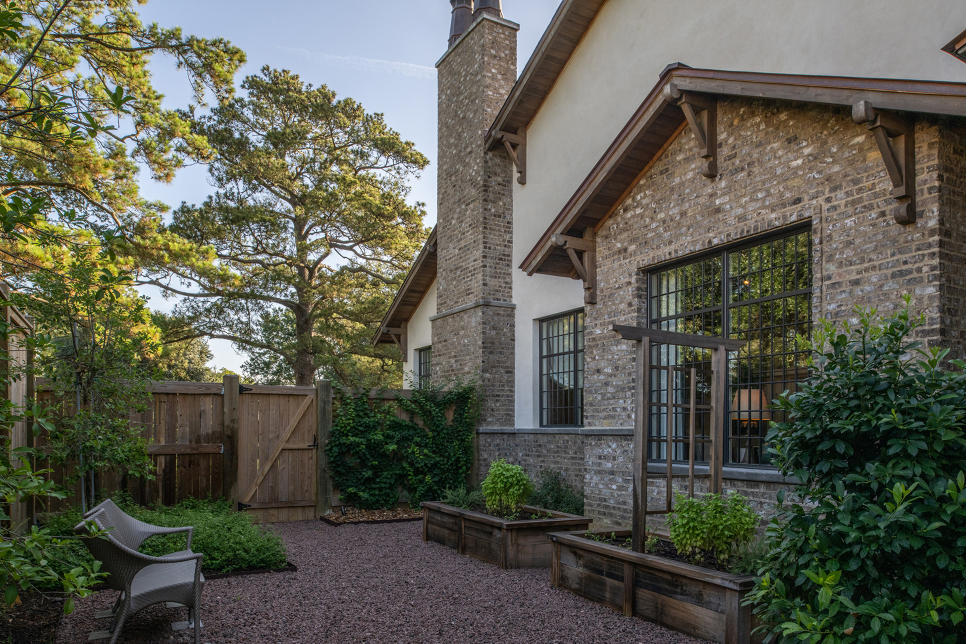 This home was built in an established neighborhood after removing the existing home and preserving the large oak and pine trees. The design morphs out of two styles, “Tudor” and “Nantucket.” both of which beg to be set in a suburban setting surrounded by aged landscaping to give the appearance of an old stately home. Given those design criteria, the materials of the home needed to reflect that same old stately appearance. That is why “Old Savannah Tumbled” king-size brick was chosen for this project. The brown hues in the brick along with the face irregularities represent that old world style and aged appearance needed to compliment the cypress, plaster and copper materials used on the exterior of the home. The warmth of the materials invite visitors into the home through the giant oaks and beautifully landscaping surrounding the home.