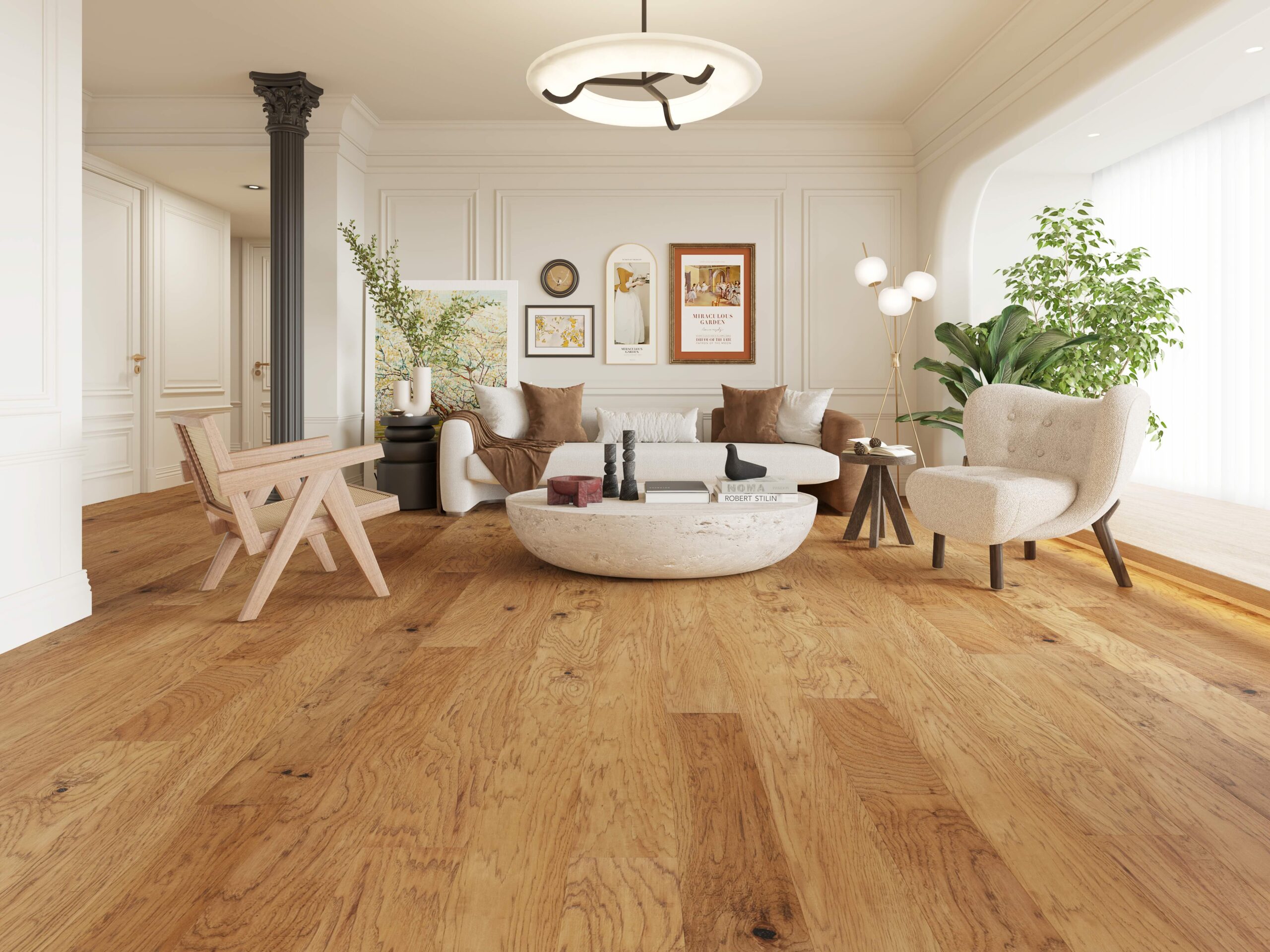Heritage Seasons is a four color North American Hickory engineered hardwood featuring wider width and long lengths that the market prefers today. This product is very lightly hand scraped and the stains are truly hand rubbed finishes similar to high end furniture.